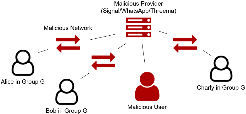 In a group setting, the same attackers apply (network, provider, other users). However the requirements for secure communication differ. It is further necessary that only group members can write to and read content from the group. Additionally, only administrators of the group are able to add new members.
