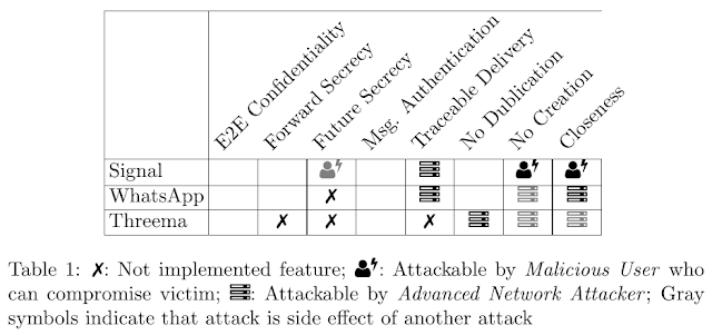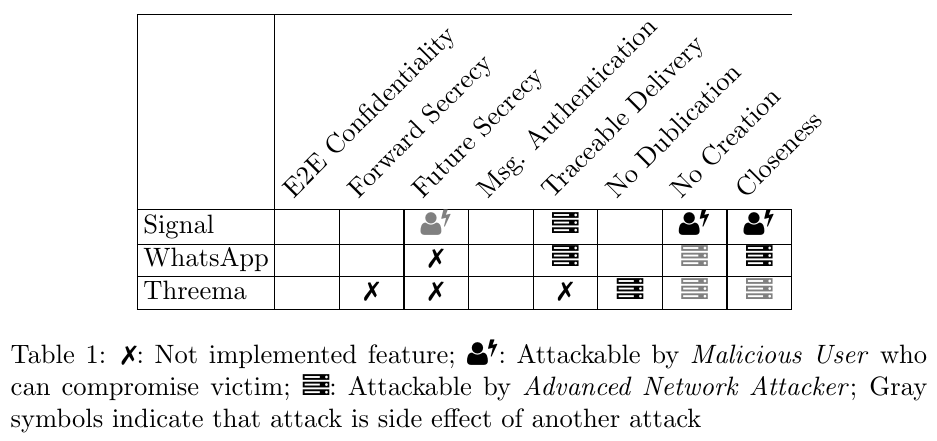 As a result, the end-to-end protection of WhatsApp is not sufficient to reach confidentiality in groups. For Signal no future secrecy is reached in groups and Threema was vulnerable to replay attacks which resulted in further weaknesses.