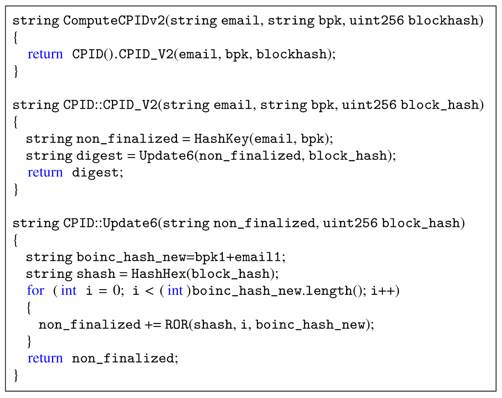 In order to protect the email addresses of Gridcoin Researchers, neither BOINC project websites nor statistical websites directly include these privacy critical data. The statistical websites only include eCPID entries, which are used to reward Gridcoin Researchers. However, the email addresses are hidden inside the computation of the BOINCHash (cf. Table 1). A BOINCHash is created every time a Researcher mints a new block and includes a CPIDv2 value. The CPIDv2 value contains an obfuscated email address with iCPID and a hash over the previous blockchain block.