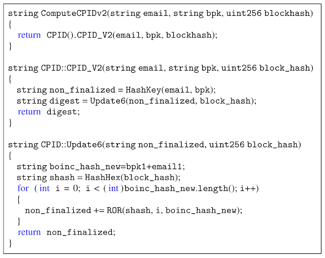 By collecting the blockchain data and reversing the obfuscation function (cf. Figure 4 and Figure 7), the attacker gets all email addresses and iCPIDs ever used by Gridcoin Researchers. See the reversed obfuscation function in Figure 4 and Figure 5.