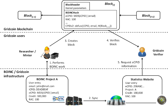 - A minter (Researcher) participates in a BOINC project A and performs computational work for it. In return the project server increases the users Total Credit value on the server. The server therefore stores the minter’s email address, iCPID, eCPID and RAC.